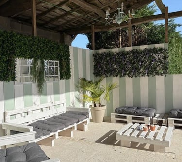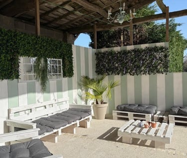 Large outside entertainment barn, with comfortable seating, drinks bar with fridge, & BBQ,